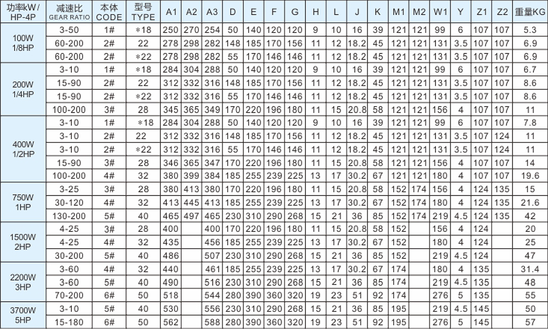 功率:100W 1/8HP~3700W 5HP 減速比:3-200 S:三相電機(jī)220V、380V/50、60Hz-3-PHASE A:單相電機(jī)110V、220/50、60Hz-Single PHASE 重量:5.3KG~57KG